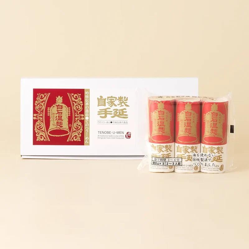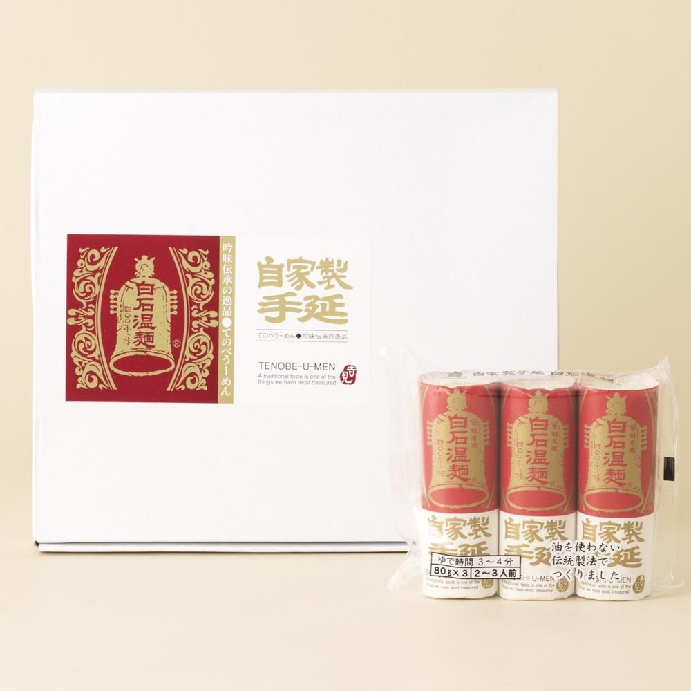 原料の小麦粉を厳選し、水加減・塩加減さらに熟成方法をその日その日に合わせて変える昔ながらの手のべ製法による温麺。一本一本丁寧に造りました。400年ほどの歴史が作り出す手延べならではの「光沢」「こし」「つるみ」を存分にご堪能下さい。