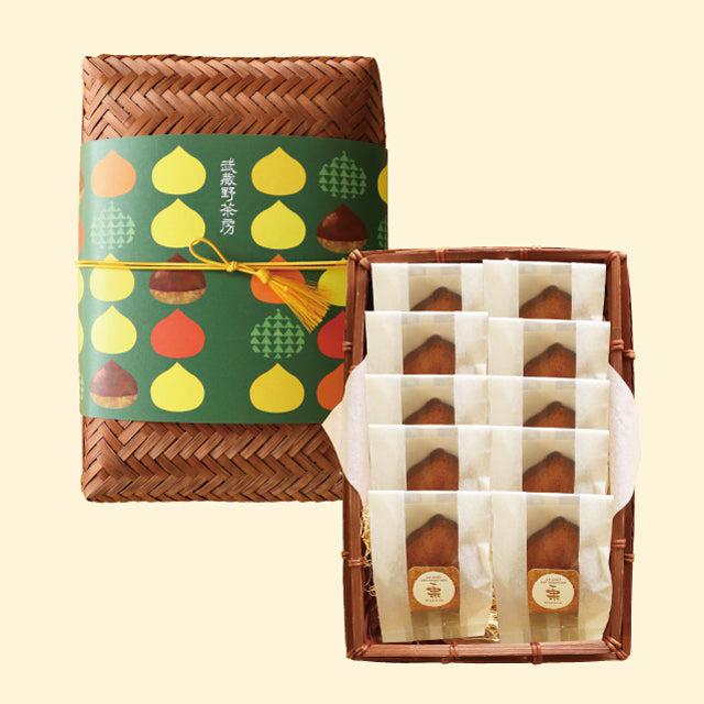 武蔵野茶房で毎年大好評をいただいている『焼き栗マドレーヌ』。竹籠にお入れしオリジナルの帯を巻いてお届けします。