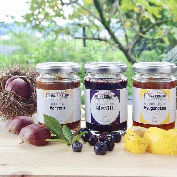 自然栽培で育てられた栗や日向夏、そしてクッチーナ・リナルドの庭で有機栽培したブルーベリーを使って作ったオーガニックジャムのセットです。