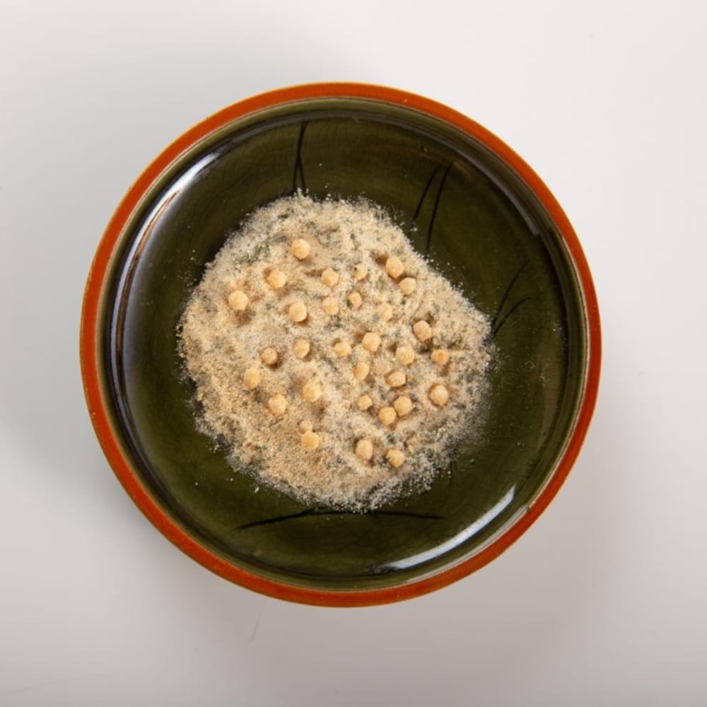 食塩(国内製造)、砂糖、粉末醤油(醤油、デキストリン)、もち米、碾茶、かつおエキス、煮干エキス、山椒、かつお粉末、昆布粉末調味料/(アミノ酸等)、(一部に小麦・大豆を含む)