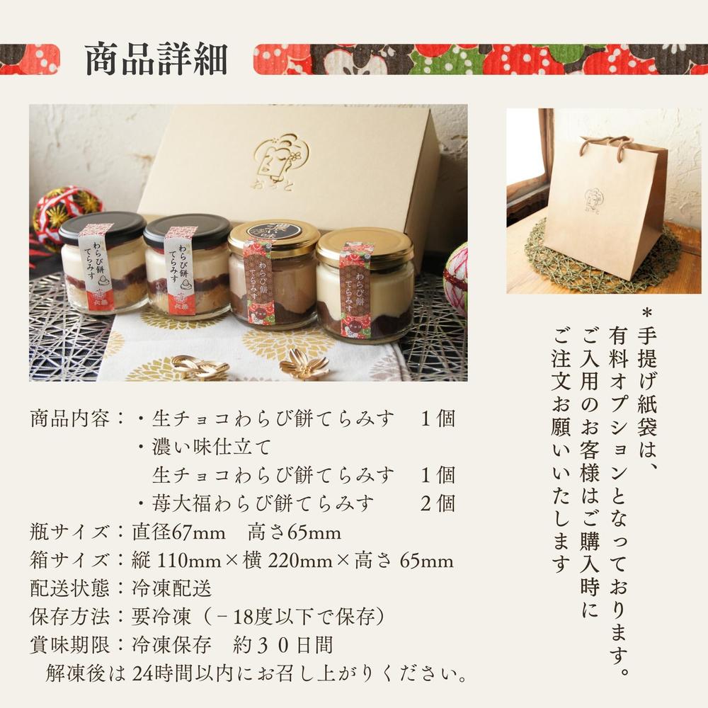 | 内容量 | ●セット内容 【4個セット】 ・生チョコわらび餅てらみす 1個 ・濃い味仕立て 生チョコわらび餅てらみす 1個 ・特選苺大福わらび餅てらみす 2個 【6個セット】 ・生チョコわらび餅てらみす 2個 ・濃い味仕立て 生チョコわらび餅てらみす 2個 ・特選苺大福わらび餅てらみす 2個 ●商品サイズ 【わらび餅てらみす】内容量:100g 瓶サイズ:直径67mm 高さ65mm ●箱サイズ 【 4個セット 】縦 110mm×横 220mm×高さ 65mm 【 6個セット 】縦 120mm×横 250mm×高さ 65mm |