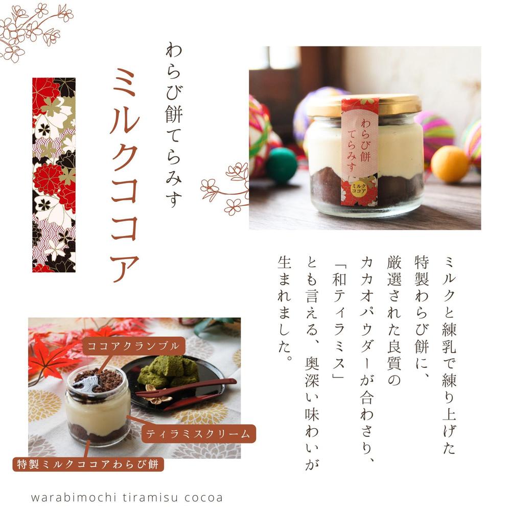 ミルクと練乳で練り上げた特製わらび餅に、厳選された良質のカカオパウダーが合わさり、「和ティラミス」とも言える、味わいが生まれました。