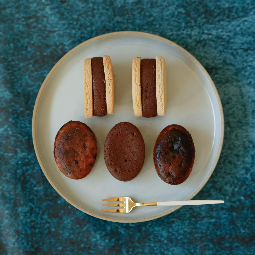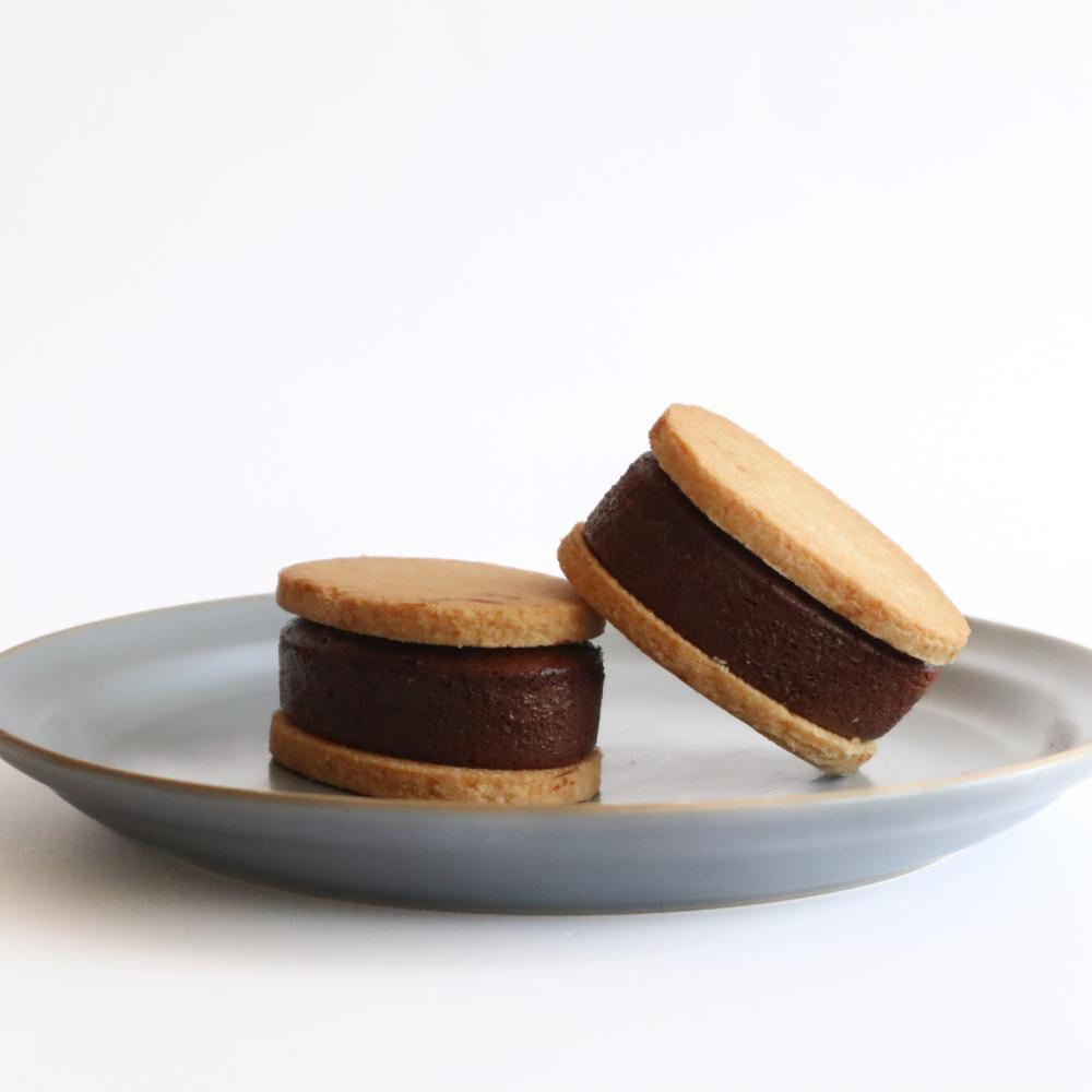 自家製米粉サブレに、Bean to Barチョコレート100%でつくった極厚テリーヌショコラをサンドしたインパクト満点の一品。