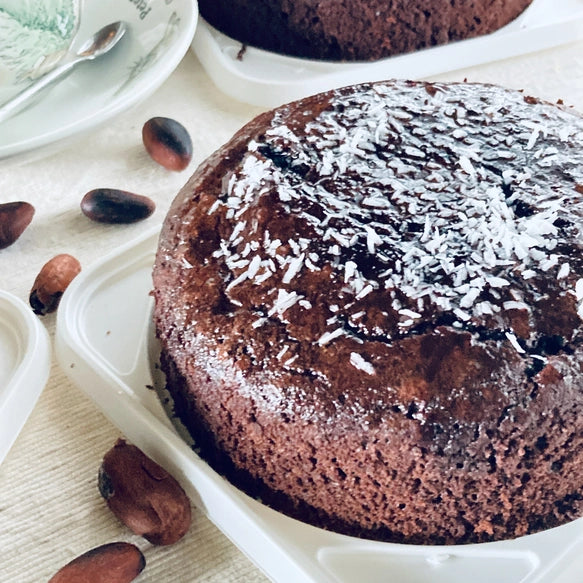 ケーキは、九州産米粉とオーガニック粗糖、宮崎産卵、オーガニックココア、長崎産菜種油だけで作ったグルテンフリーガトーショコラ。