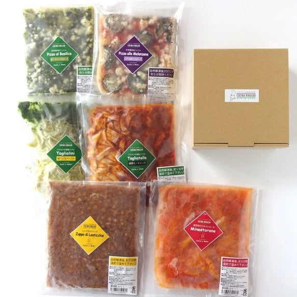 スープ(225g×2袋), パスタ(250g/170g), 天然酵母ピザ(2枚/2種類:1枚約13cm×15cm),ガトーショコラ(直径11cm) |