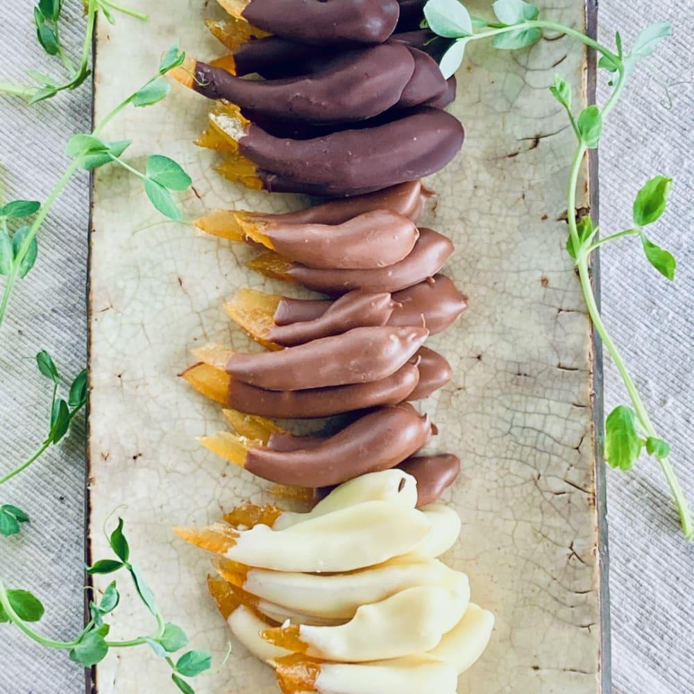 宮崎綾町産自然栽培日向夏の皮をオーガニック粗糖で長時間かけて煮込んで作ったピールに、完全無添加のオーガニッククーベルビターチョコ、オーガニッククーベルミルクチョコ、オーガニッククーベルホワイトチョコをテンパリングして1本1本手で丁寧に作りました。