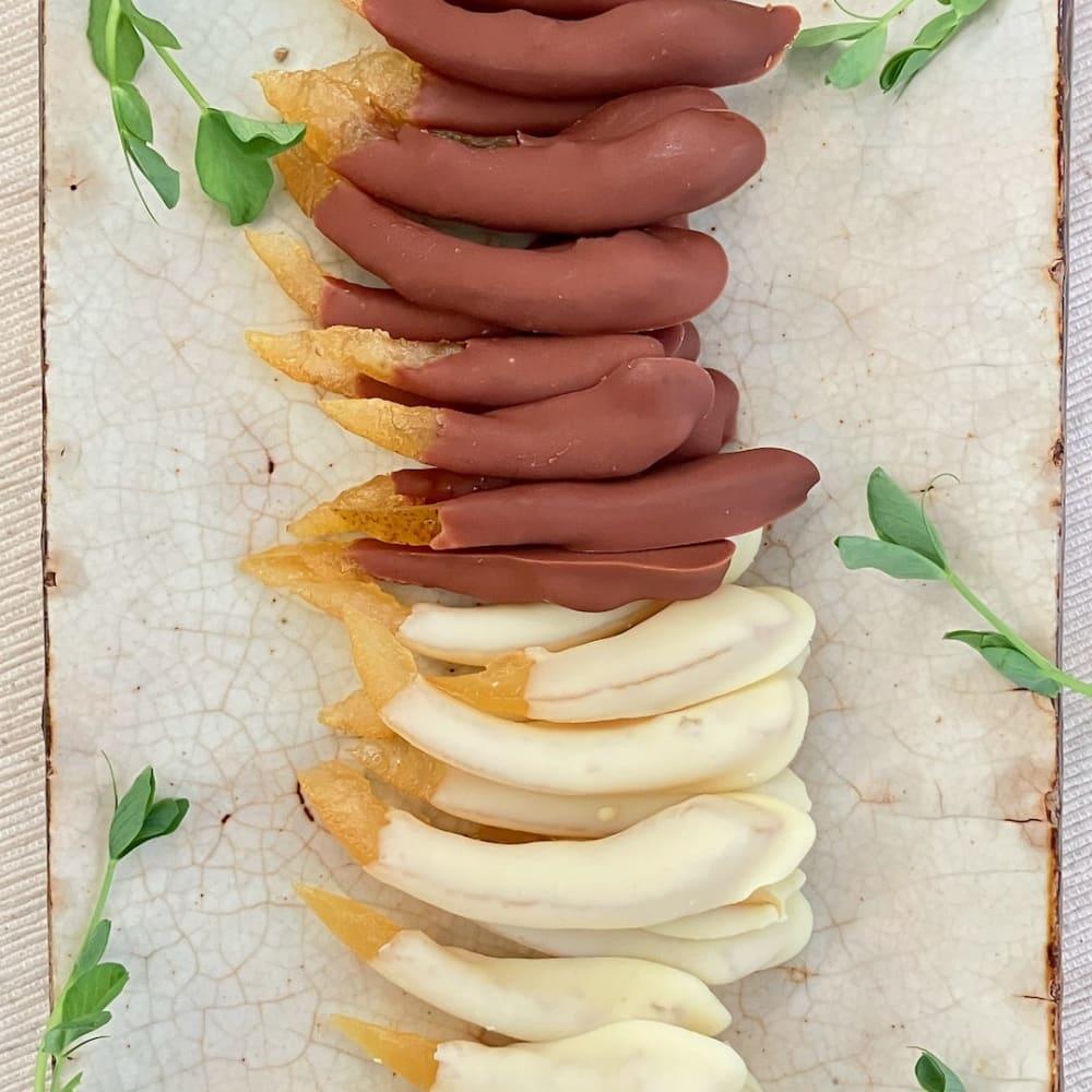 宮崎綾町産自然栽培日向夏の皮をオーガニック粗糖で長時間かけて煮込んで作ったピールに、完全無添加のオーガニッククーベルチョコをテンパリングして1本1本手で丁寧に作りました。