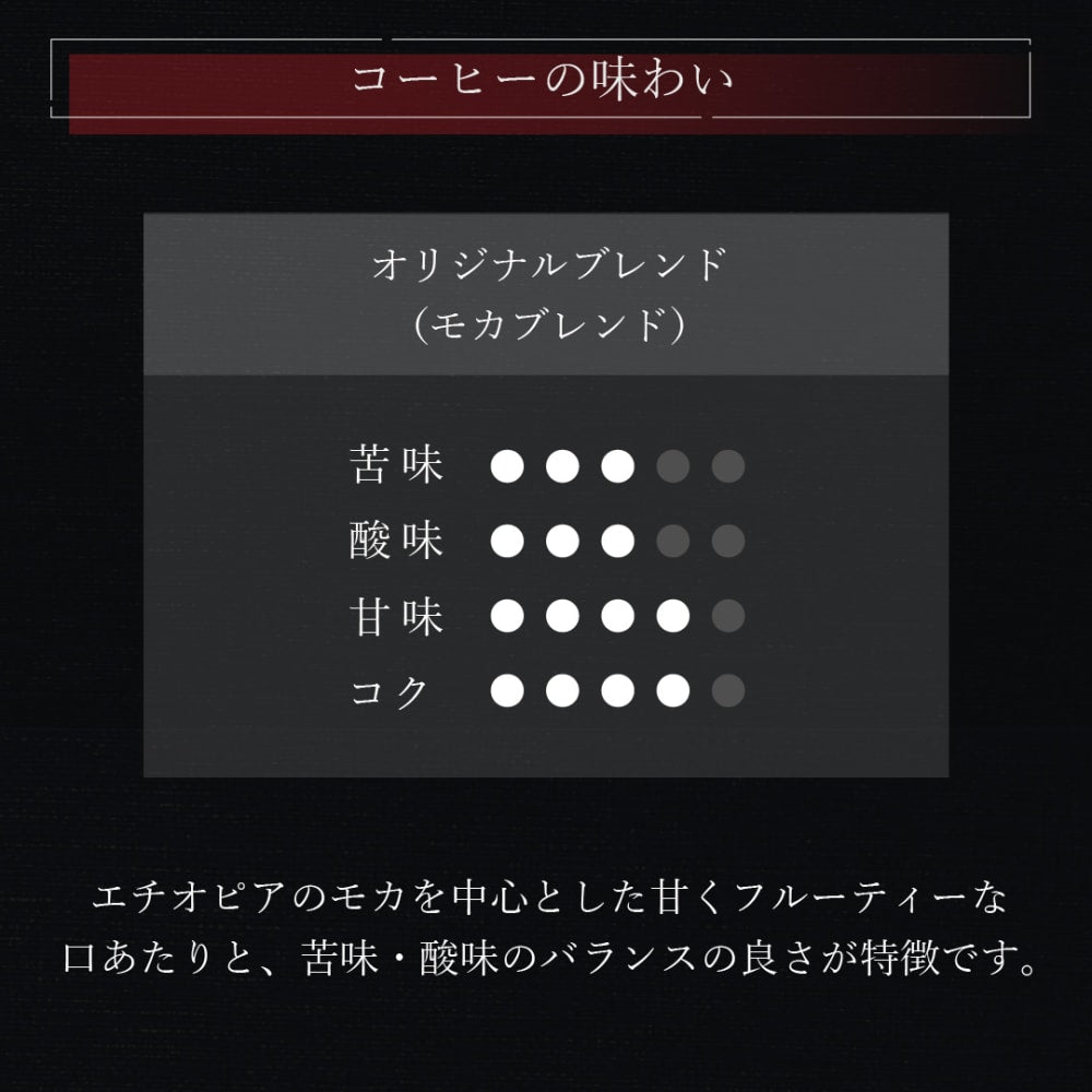 神戸・萩原珈琲のオリジナルブレンドは、モカをベースにした甘くフルーティーな口あたりと、苦味・酸味のバランスの良さが特徴。