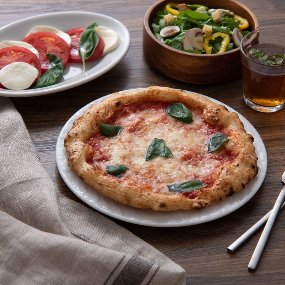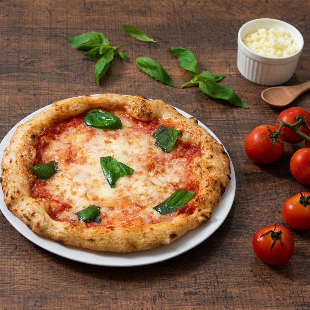 熟練の職人の手伸ばしで成形させた生地は24時間以上過発酵をさせることで小麦の使用を最小現におさえた、さっくり軽い食感です。厳選されたイタリア産素材(トマト、塩、オリーブオイル、モッツアレラチーズ)の具材は余計な調味料を加えず、短時間の高温調理により素材そのものの旨みを引き出します。焼き上がりを瞬間冷凍させることで焼き立ての味を一気に封じ込めます。