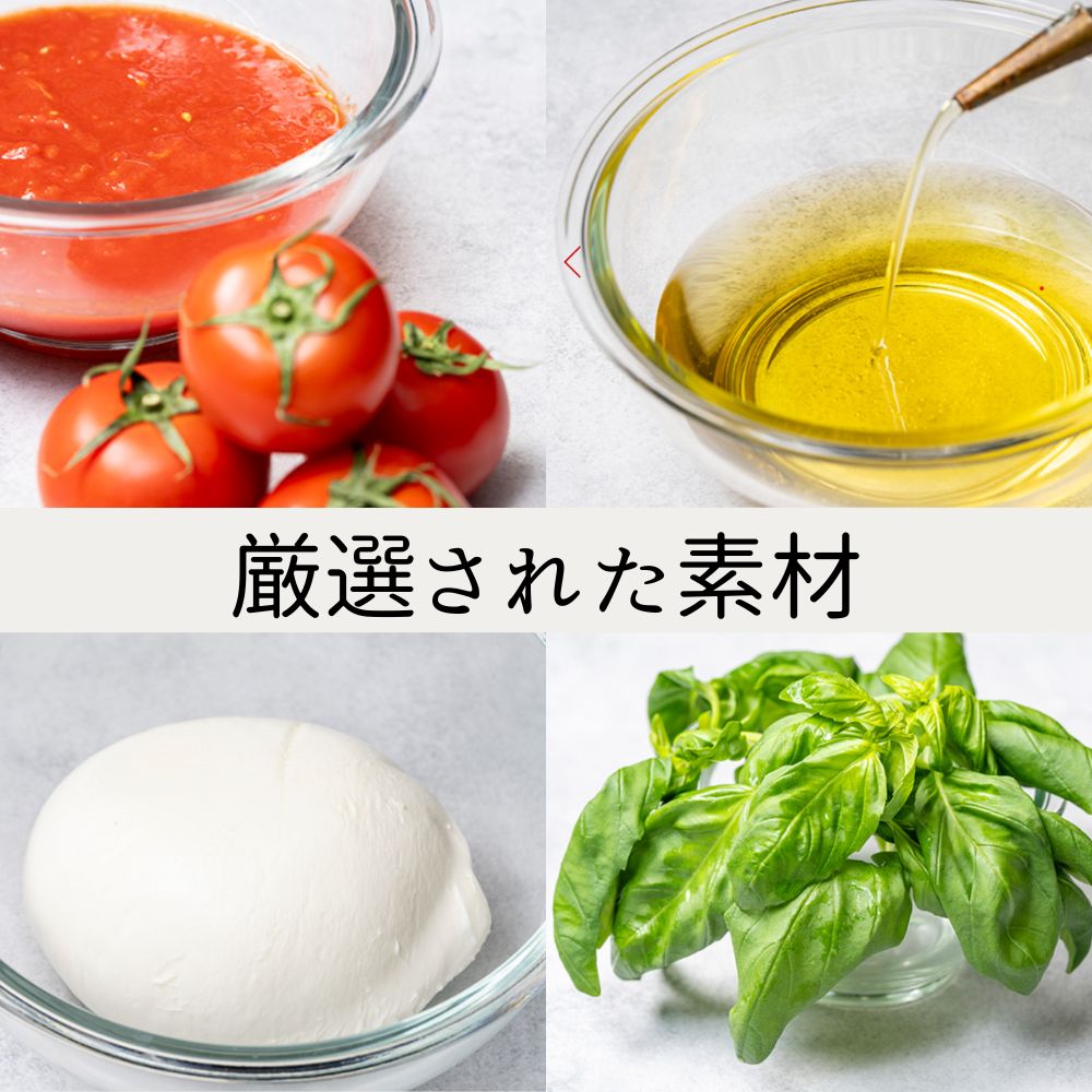 原材料 小麦粉(国内製造)、トマト・ピューレーづけ、ナチュラルチーズ、食用オリーブ油、食塩、バジル、パン酵母、(一部に小麦・乳成分を含む)