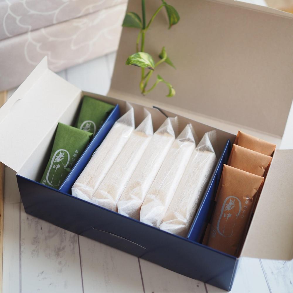 つぶ餡と抹茶餡の2種の味わいを、華やかな化粧箱に詰め合わせました。